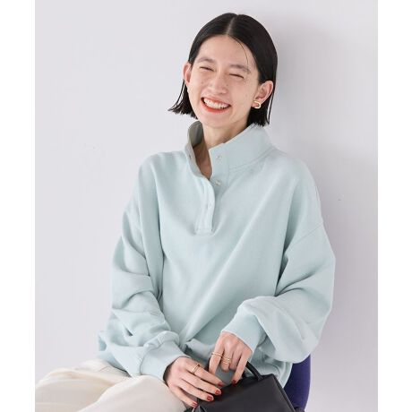 ハイネック×ハーフボタンデザインが特徴的なスウェットプルオーバー。襟元の刺繍が洒落感のあるアクセントになっています。ストレッチ性に優れた裏毛素材のコンフォートな着心地も魅力的。程よくリラクシーなシルエットにシンプルなワンカラーで着回し力抜群のカジュアルトップスです。