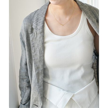 華奢で女性らしい雰囲気なので、メンズライクなアイテムやシャツのインナーで着ていただくと、程よいバランスで着ていただけるのでオススメです。