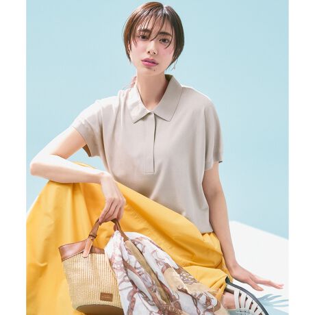 フレンチスリーブの大人のポロニット。ボタンを上まで閉めると、ボタンが見えない仕様なのでクラシカルな女性らしい雰囲気も叶います。ドルマンラインで身頃にゆったり感があり、二の腕をさりげなくカバーしてくれるのもうれしいポイント。ボトムはスカートでもパンツでも好相性で、コーディネート全体をきれいめにまとめあげます。カラーは、ベーシックなブラック(#005)、やさしい雰囲気のベージュ(#033)、洒落感のあるダークブルー(#065)の3色展開です。