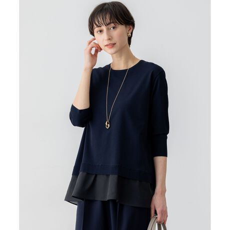 シアー感のあるシャツ素材をヘムにドッキングしたレイヤード風のプルオーバーニット。女性らしいネックラインにひじ下までの袖丈で、春~秋と長いシーズン楽しめるアイテムです。ドッキングしたシャツ部分は配色になっていて、レイヤードスタイルを引き立てます。バックスタイルはウエスト位置から下にかけて重なりのある開きをつけることで、軽さのある仕立てにしています。カラーは、やわらかな印象のベージュ(#033)、洒落感のあるダークブルー(#065)、シックなネイビー(#075)の3色展開です。
