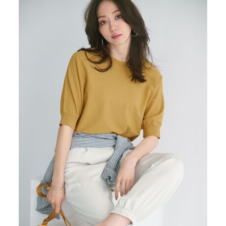 締め付けのないボリューム感のひじ丈ドルマン袖が女性らしい印象のプルオーバーニット。裾をアウトにしてワイドシルエットを楽しんだり、インにして袖のフォルム感を強調したモダン大人スタイルにこなしたりと、幅広い着こなしを叶えるデザインです。ストレッチが効いた素材で、イージーケア&着心地もストレスフリー。夏~初秋まで季節をまたいで大活躍するアイテムです。カラーは、無地とバイカラーの計8色と豊富な展開でオンオフ着回しやすく、何枚も欲しくなるラインナップ。無地は清潔感のあるホワイト(#001)・ベーシックなブラック(#005)・鮮やかなオレンジ(#020)・やさしい印象のベージュ(#033)・アクセントになるマスタード(#040)・洗練されたダークグリーン(#065)の6色展開。バイカラーはコントラストが目を引くベージュ×ブラック(#533)・洒落感のあるダークグリーン×ネイビー(#565)の2色展開です。