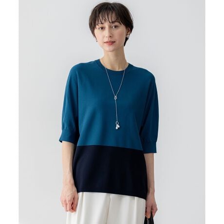締め付けのないボリューム感のひじ丈ドルマン袖が女性らしい印象のプルオーバーニット。裾をアウトにしてワイドシルエットを楽しんだり、インにして袖のフォルム感を強調したモダン大人スタイルにこなしたりと、幅広い着こなしを叶えるデザインです。ストレッチが効いた素材で、イージーケア&着心地もストレスフリー。夏~初秋まで季節をまたいで大活躍するアイテムです。カラーは、無地とバイカラーの計8色と豊富な展開でオンオフ着回しやすく、何枚も欲しくなるラインナップ。無地は清潔感のあるホワイト(#001)・ベーシックなブラック(#005)・鮮やかなオレンジ(#020)・やさしい印象のベージュ(#033)・アクセントになるマスタード(#040)・洗練されたダークグリーン(#065)の6色展開。バイカラーはコントラストが目を引くベージュ×ブラック(#533)・洒落感のあるダークグリーン×ネイビー(#565)の2色展開です。