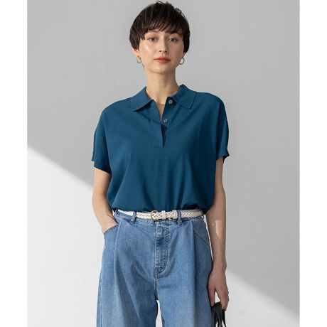 フレンチスリーブの大人のポロニット。ボタンを上まで閉めると、ボタンが見えない仕様なのでクラシカルな女性らしい雰囲気も叶います。ドルマンラインで身頃にゆったり感があり、二の腕をさりげなくカバーしてくれるのもうれしいポイント。ボトムはスカートでもパンツでも好相性で、コーディネート全体をきれいめにまとめあげます。カラーは、ベーシックなブラック(#005)、やさしい雰囲気のベージュ(#033)、洒落感のあるダークブルー(#065)の3色展開です。