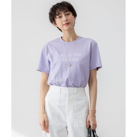 襟ぐりのラインに沿ったメッセージロゴと胸もとの2段のロゴがデザインされたロゴTEE。キャミワンピやオールインワンなどのインナーとして着ても、襟ぐりのロゴが引き立つデザインです。ロゴは、フランス語でブランドのシーズンテーマ(リネン素材にはせた思い)に沿って、会話のような文章を綴っています。Lin,Ma Passion(リネンに夢中)/ Oui Je Vois(うんわかるよ)/ Tu Vois(そうでしょ) カラーは、ベーシックなホワイト(#001)、抜け感のあるグレー(#004)、ヘルシーな印象のイエロー(#040)、ニュアンス感のあるライラック(#082)の4色展開です。