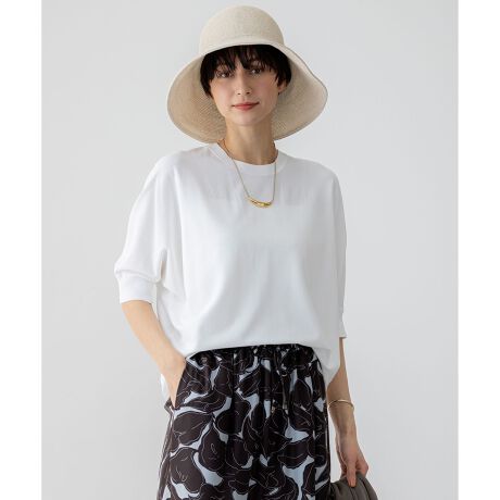 サラサラとした風合い、爽やかな肌触りが特徴の23区の人気定番素材です。ほど良い光沢感が大人らしさを上品に引き立てます。収縮性に富んだレーヨンストレッチ糸を使っているため型崩れが少なく、微細な凹凸が出る独特の表面感がボディラインを拾わず、ほど良い肉厚感に仕上がるのが特長です。ストレスフリーな着心地と手洗いOKのイージーケアを加えデイリーに活躍する便利アイテムです。