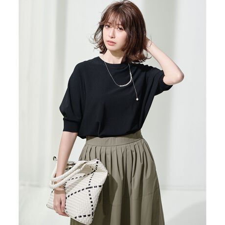 サラサラとした風合い、爽やかな肌触りが特徴の23区の人気定番素材です。ほど良い光沢感が大人らしさを上品に引き立てます。収縮性に富んだレーヨンストレッチ糸を使っているため型崩れが少なく、微細な凹凸が出る独特の表面感がボディラインを拾わず、ほど良い肉厚感に仕上がるのが特長です。ストレスフリーな着心地と手洗いOKのイージーケアを加えデイリーに活躍する便利アイテムです。