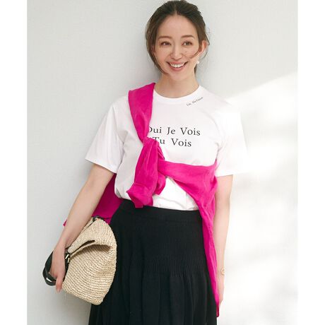 襟ぐりのラインに沿ったメッセージロゴと胸もとの2段のロゴがデザインされたロゴTEE。キャミワンピやオールインワンなどのインナーとして着ても、襟ぐりのロゴが引き立つデザインです。ロゴは、フランス語でブランドのシーズンテーマ(リネン素材にはせた思い)に沿って、会話のような文章を綴っています。Lin,Ma Passion(リネンに夢中)/ Oui Je Vois(うんわかるよ)/ Tu Vois(そうでしょ) カラーは、ベーシックなホワイト(#001)、抜け感のあるグレー(#004)、ヘルシーな印象のイエロー(#040)、ニュアンス感のあるライラック(#082)の4色展開です。