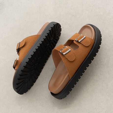 ダブルベルトデザインのフラットサンダル。