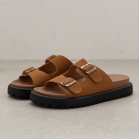 ダブルベルトデザインのフラットサンダル。