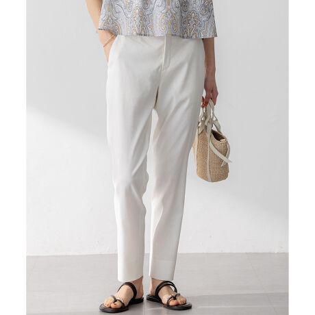 程よいゆとり感と後ろゴム仕様で穿き心地抜群のテーパードパンツ。前開き・ベルトループ付きのきちんとした仕様でフロントはスッキリと見えつつ、ウエストの後ろをゴムにすることで楽な着心地を実現。またヒールを履いてもパンツの裾が靴にかからない絶妙なレングスに仕上げています。リネン混でさらっとした着心地の素材感が春夏にぴったりです。どんなトップスにも合わせやすい万能パンツで、ベーシックカラーから着るだけで気分を上げてくれる華やかなカラーまでカラーバリエーションも豊富に取り揃えております。同素材のジャケットとのセットアップ対応も可能です。カラーはON/OFF使えるブラック(#005)、ネイビー(#075)、清涼感のあるホワイト(#001)、柔らかなベージュ(#033)、洒落感のあるダークブラウン(#035)のベーシックカラー5色に、オレンジ(#020)、イエロー(#040)、ダークグリーン(#065)のアクセントカラー3色を加えた、全8色展開です。