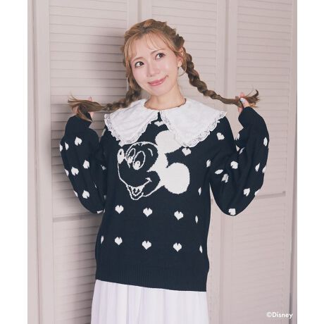 あたたかみのあるほっこりした風合いのニットにレトロでかわいい「ミッキー」のアートとたくさんのハートを散りばめた着ているだけでテンションがあがるような一枚。