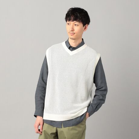 透かし編みを前身に施し、透け感とレイヤードが楽しめます。