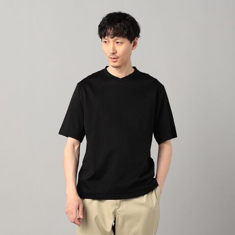 襟元のリブを裾にもあしらった、VネックのリブTシャツです。