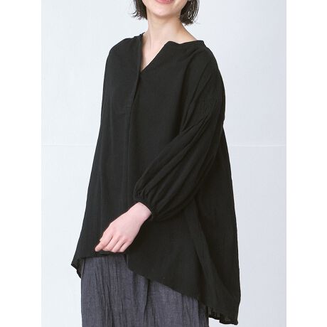 綿ジョーゼット素材で仕立てたキーネックブラウスです。