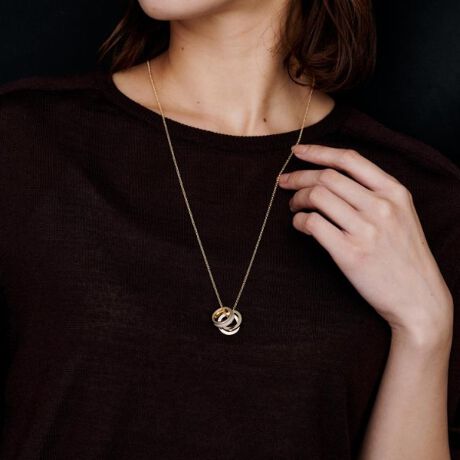 メタルとニュアンスカラーの組合せがエレガントな表情を見せるネックレス。