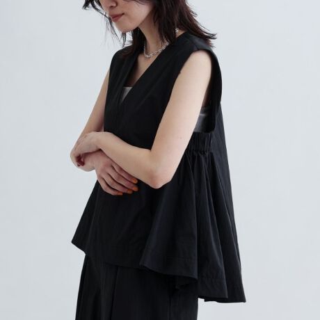 前スナップを留めてスリーブレスブラウスとしてや、カジュアルなTシャツやタンクトップの上に重ねてジレとしてレイヤードスタイルを楽しむことも可能です。