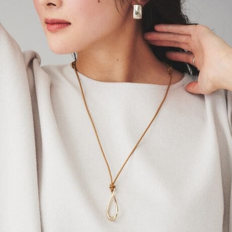 メタルのトップとナチュラルなコードの首紐の組み合わせが控えめな優しい印象です。