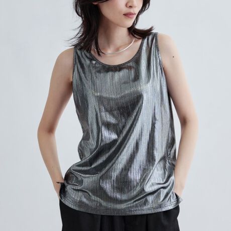 箔プリントリブ素材を用いたタンクトップは、光の加減で輝きを放つ独特な表情が魅力的。