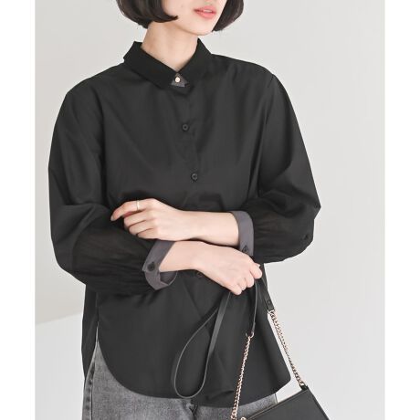 衿元と袖口を異素材で切り替えたシンプルでいて存在感のあるシャツブラウス。