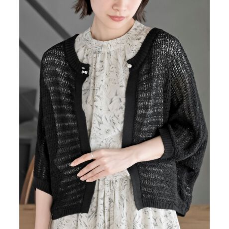 襟元のパールボタンとリボンモチーフがフェミニンなアクセントになったカーディガン。