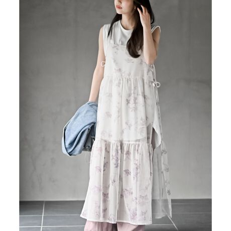 フラワープリントが品の良いメッシュキャミワンピ