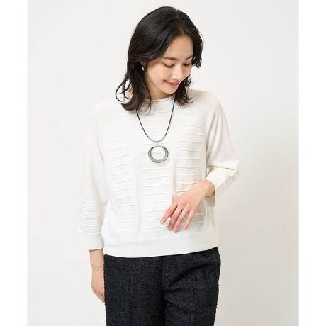 天竺ロール柄ニットプルオーバーです。見頃と袖に入れたロール柄が楽しいニットです。裾や袖口はストレートに仕上がるカノコ編みにしています。袖口は広めにしたラグランスリーブ、衿リブには透明糸を使用したシアーボーダーを入れています。3Dニット(ホールガーメント)の製品になります。