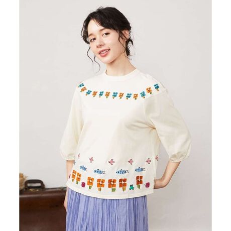 半端袖のカットソーはロングシーズン使える便利なアイテム。ホコモモラらしい刺繍がアクセントになり、シンプルな無地ボトムとも良く合います。