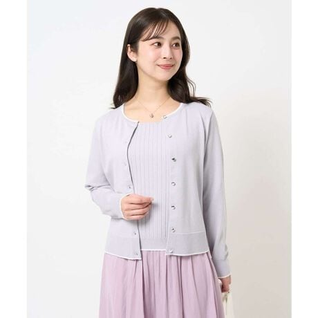 配色デザインがポイントのカーディガンと五分袖のプルオーバーのアンサンブル。コンパクト見えなサイズ感できちんとした印象で着こなせます。カーディガンはシルバー釦と細幅の配色ラインがポイントで単品性も◎。プルオーバーも着こなせる期間が長いので、セットであると季節問わず活躍してくれるはず。