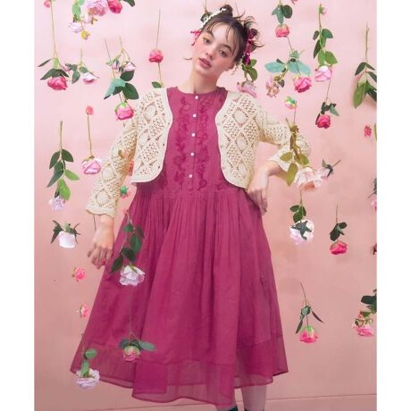 インドからやってきた軽やかなワンピース。テーマの「花のローズ」からインスピレーションを受けています。夏場の暑い日にも活躍してくれる風通しの良いリラクシーな着用感が魅力のシルエット。身頃にはメイドインインドならではのピンタックや、メッシュ生地とアップリケ刺繍で表現したお花と蝶々のモチーフがデザインのポイントに。ウエスト部分にはギャザーをたっぷり寄せ、フレンチスリーブ風の短めのそで丈が女性らしい印象を後押しします。裾にはメッシュ素材で切り替えを施し、足元も軽く見えるように工夫しました。さり気ない貝ボタンにも注目。褒められ間違いなしのワンピースは今季イチオシのオススメアイテムです。