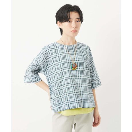 細かい凹凸に重なるチェック柄の素材を使用したゆったりショート丈のプルオーバーブラウス。