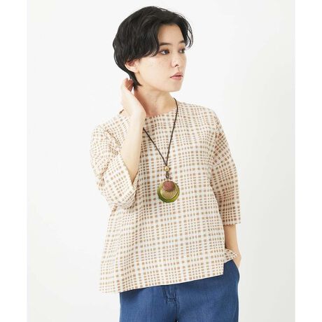細かい凹凸に重なるチェック柄の素材を使用したゆったりショート丈のプルオーバーブラウス。