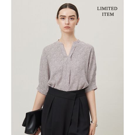 ■デザイン単品でもジャケットインでも便利なキーネックブラウス。上品な雰囲気ながらモード感もプラスされた一枚です。ゆとりのある五分袖デザインで、気になる二の腕がしっかり隠せるのも嬉しいポイント。普段使いからリモートワーク、オフィスシーンまで幅広く活躍します。