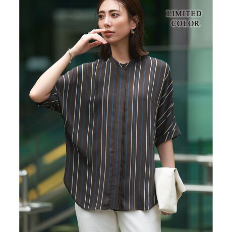 ■デザイン比翼仕立てのバンドカラーブラウス。前立て部分の配色デザインでアクセントを効かせました。ゆとりのある五分袖デザインで、気になる二の腕がしっかり隠せるのも嬉しいポイント。普段使いからリモートワーク、オフィスシーンまで幅広く活躍します。