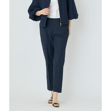 綿麻混のポリエステル素材を使用。白や淡色でも透けにくく安心して着用頂けるきれいめパンツ。ウエスト位置を高めに設定することで脚長効果が期待出来ます。膝下に向かって細くなるテーパードに近いやや細身のシルエット。センタープレスが入ることで脚のラインをすっきりと見せ、きちんと感を叶えました。フロントデザインはすっきりとさせつつバックゴム仕様で穿き心地の良さにも配慮しました。キレイ目にもカジュアルトップスにも合わせていただける汎用性の高いパンツです。・オフホワイト裏地あり・ポケットあり・ウエスト後ろゴム仕様・水洗い可■サンプル撮影商品■こちらの商品はサンプルでの撮影となっております。実際の商品とは、サイズや色味、素材、デザイン等の仕様が若干変更になる場合がございます。