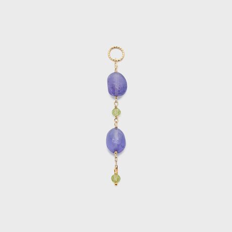サイズの異なるタンザナイトとペリドットをライン上に配置しリズミカルに仕立てたチャーム。遊び心のある色合いと軽やかな揺れ感がポイント。フープピアスと組み合わせてピアスチャームに、ネックレスに通してネックレスチャームに。様々なコーディネートを楽しめます。※天然石や天然素材を使用しているものは、サイズ・色味・風合いの違いや、若干の傷、内包物の有無などに個体差があります。予めご了承ください。※シャンク線はゴールドフィルド、その他の部分はK10を使用しています。
