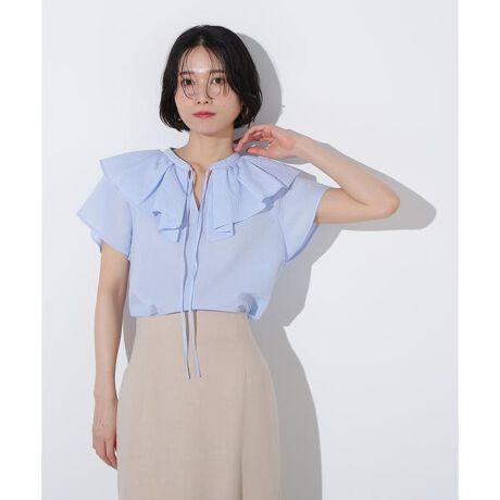 大きいラッフルデザインが可愛らしいブラウスです。襟はカッティングされているので抜け感があり、大きめのラッフルとリボンが顔まわりを華やかに見せてくれます。リボンは垂らしても結んでも◎。肩先をおおった袖丈が、気になる二の腕をほっそり見せに。デニムアイテムやタックパンツ合わせがおすすめです。<素材>ポコポコとした表面のサッカー生地を使用。さらっとしていて夏に適した素材です。<詳細>仕様・開閉なし裏地・なし透け感・ややあり / 光沢・なし / 伸縮性・なし生地の厚さ・普通※モデルの着用画像の場合、光の当たり具合により、実際の色味と異なって見えることがございます。色味は、商品単体の画像をご参照ください。