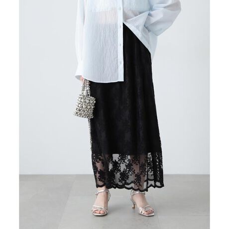 >>同型商品はこちら<< 女性らしさを引き立てる繊細なレース素材を使用したAラインスカート。甘くなりすぎないレースの配置や涼やかなディテールがこれからの季節に着映えるデザイン。裾に向かって緩やかに広がるAラインに、裾まわりのカッティングや軽やかな透け感が、足元に抜け感を演出します。シャツ、シアーニット、Tシャツ合わせもお勧めです。<素材>繊細でランジェリーライクなレースを使用しています。<詳細>仕様・左ファスナー裏地・あり透け感・あり / 光沢・なし / 伸縮性・ややあり生地の厚さ・薄手※モデルの着用画像の場合、光の当たり具合により、実際の色味と異なって見えることがございます。色味は、商品単体の画像をご参照ください。