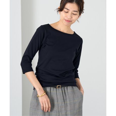 別注で作成したボートネックTシャツは、開きすぎないネックと、手元がすっきりとした七分袖とのバランスにこだわり、ボリュームのあるパンツやスカートにもバランスよく合わせられる仕上がり。