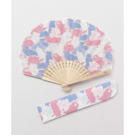[型番:7XCP5101-2025]花に囲まれてのんびり過ごす猫たちが描かれた扇子。ほたて型の丸くて可愛らしい形が特徴的。持ち運びに便利な専用袋付き。オリジナルの刻印入り。