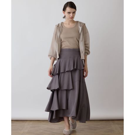 ほのかに光沢がある、薄手のマットなサテン素材でお作りしたロングスカート。 今季らしいアシンメトリーフリルを飾った、360度どの角度から見てる映える華やかな表情が、着こなしを優雅に印象付けます。綺麗な落ち感&ドレープが非常に綺麗で、大胆にフリルを飾りながらも広がり過ぎず、大人な雰囲気を醸し出します。ウエスト周りはすっきりとさせ、甘すぎないデザインに。上品に着映える、グレイッシュなダスティーカラーをご用意しました。