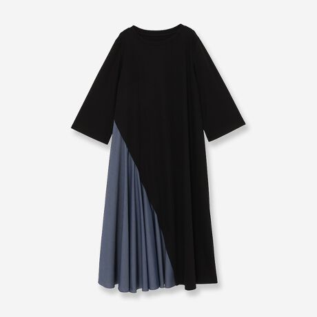 カットソー素材ワンピースにハリ感のあるタイプライター素材のフレアを入れた一枚。