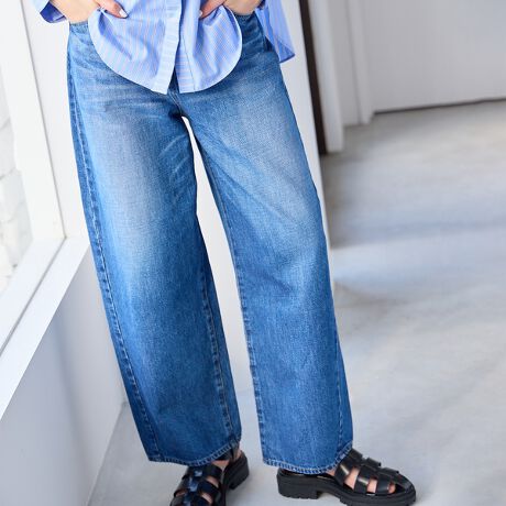 太ももにかけてややカーブさせたワイドフィットなシルエットで、裾にかけて徐々に細くなっています。