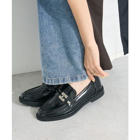 エナメル調素材の光沢感が上品な雰囲気を演出するデザインローファー。
