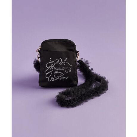 マットなサテン生地にラインストーンのロゴがフェミニンなポシェット。