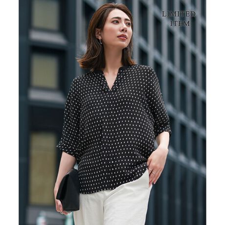 ■デザイン単品でもジャケットインでも便利なキーネックブラウス。上品な雰囲気ながらモード感もプラスされた一枚です。ゆとりのある五分袖デザインで、気になる二の腕がしっかり隠せるのも嬉しいポイント。普段使いからリモートワーク、オフィスシーンまで幅広く活躍します。