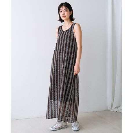メッシュ×ストライプが目を引く爽やかなワンピース。華奢みえし、スタイルアップが叶います。 首元の紐であき具合の調整が可能です。