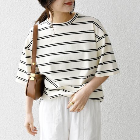 衿元と袖元のリブもあえて同じボーダー柄をあしらい、左脇下にさりげなくブランドネームをワンポイントで施した細部にもこだわったデザインが◎