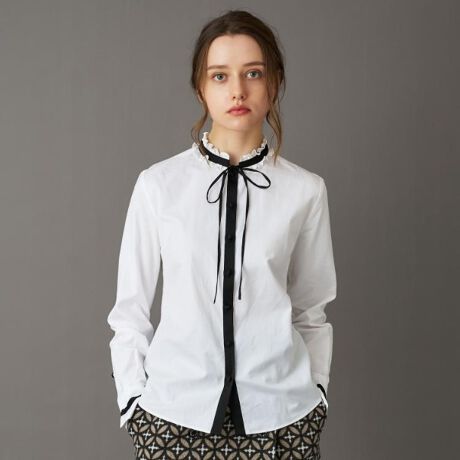 衿元のフリル、配色のデザインがポイントになった人気のブラウスを、素材と釦をブラッシュアップしてご用意しました。