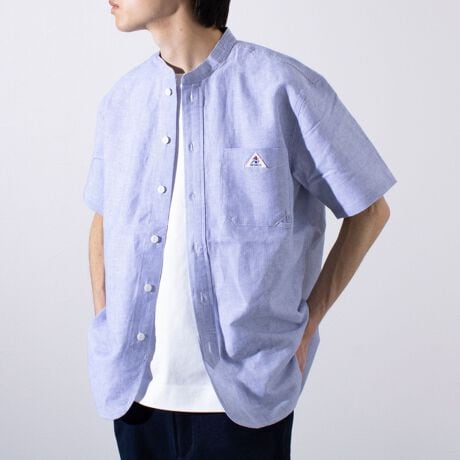 春夏らしい綿麻のシャリ感のある生地を使用した半袖バンドカラーシャツ。