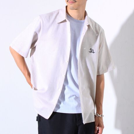 #フレンチブルドッグ刺繍 #綿麻シャツ #半袖シャツ #スケボー犬 #GLOSTER #夏コーデ #ゆったりシャツ #パナマ素材 #遊び心コーデ